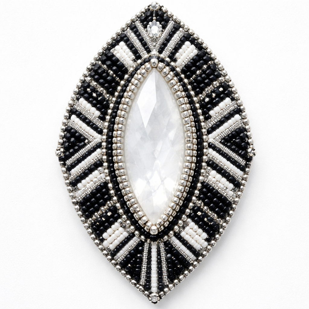 Art deco, black and white cylinder seed beads form a balanced pattern around a 30mm x 15mm white quartz marquis stone