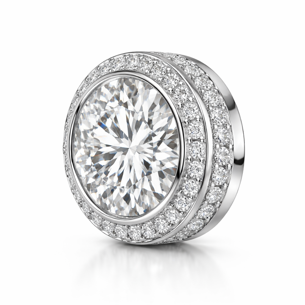 Brilliant round diamond pendant hidden bail set in a white gold pave diamond bezel with a side Pave setting of diamonds in the side of the diamond bezel all the way around the diamond show the side profile of the bezel with the side diamonds in the picture remove the prongs in the center diamond and remove the bail make the side of the bezel a little thicker keep the thickness of the side basil but just have one row of pave Diamonds on the side basil with high polished gold showing up against the Pavey line of diamonds on the side bezel