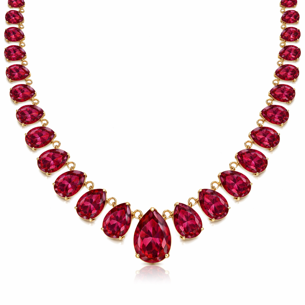 Create a Ruby calibrated layout in gold, featuring pear Rubies in prong settings.