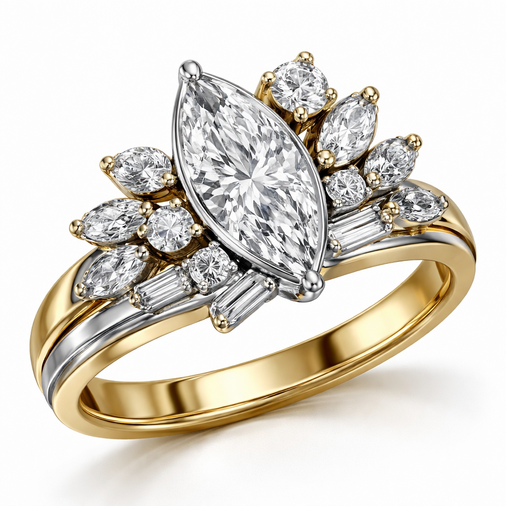 Asymmetrical diamond ring design with 1 .6 marquise , 1 .25 round , 6 smaller marquise, 2 .15 round and 4 .1 baguettes on a yellow gold band set in platinum , retro style