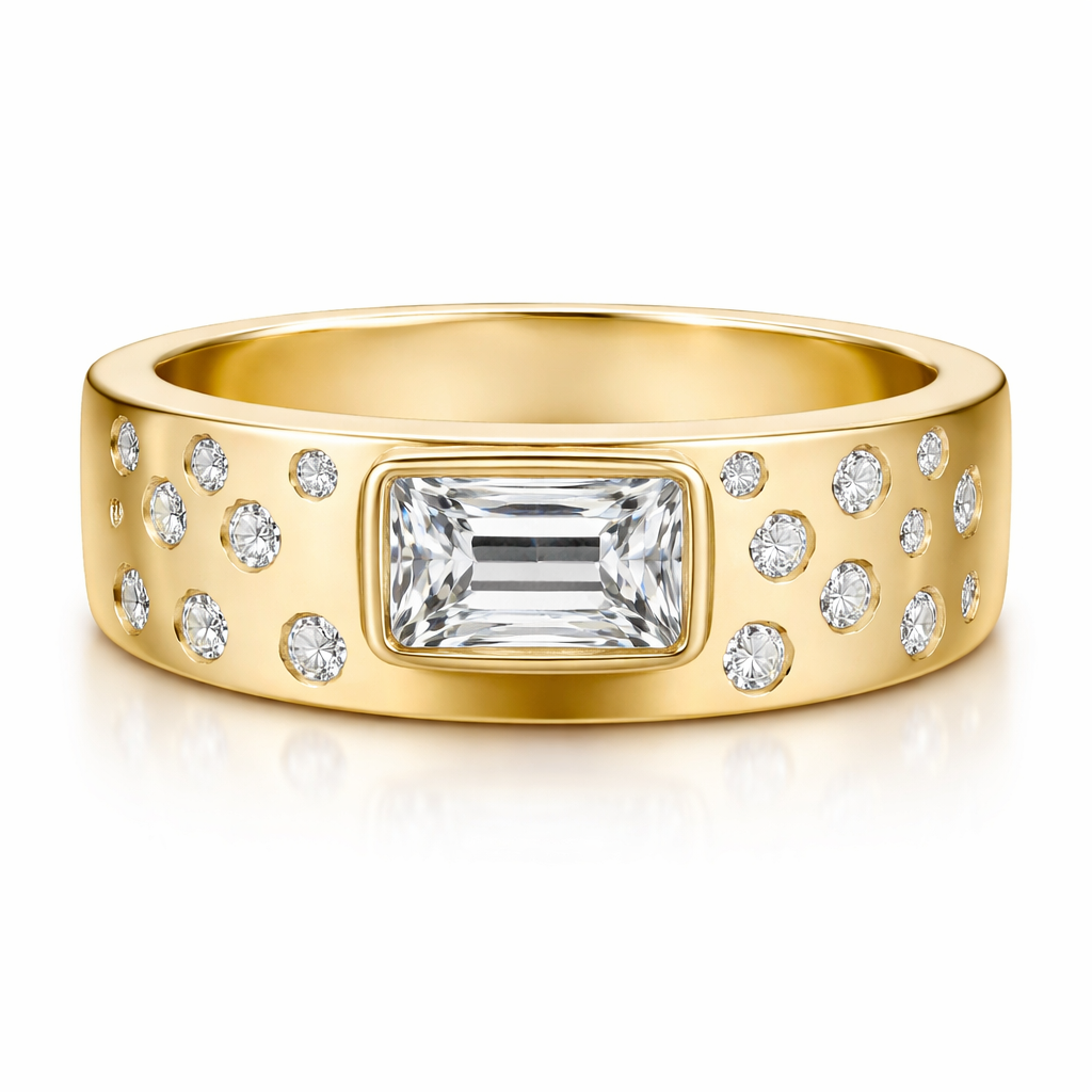 6mm gold band with one carat emerald cut diamond set horizontally with 20 small round diamonds scattered