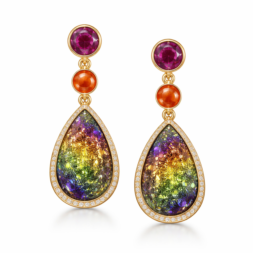 Design small earrings using rainbow pyrite, purple ruby, and carnelian. , modern style