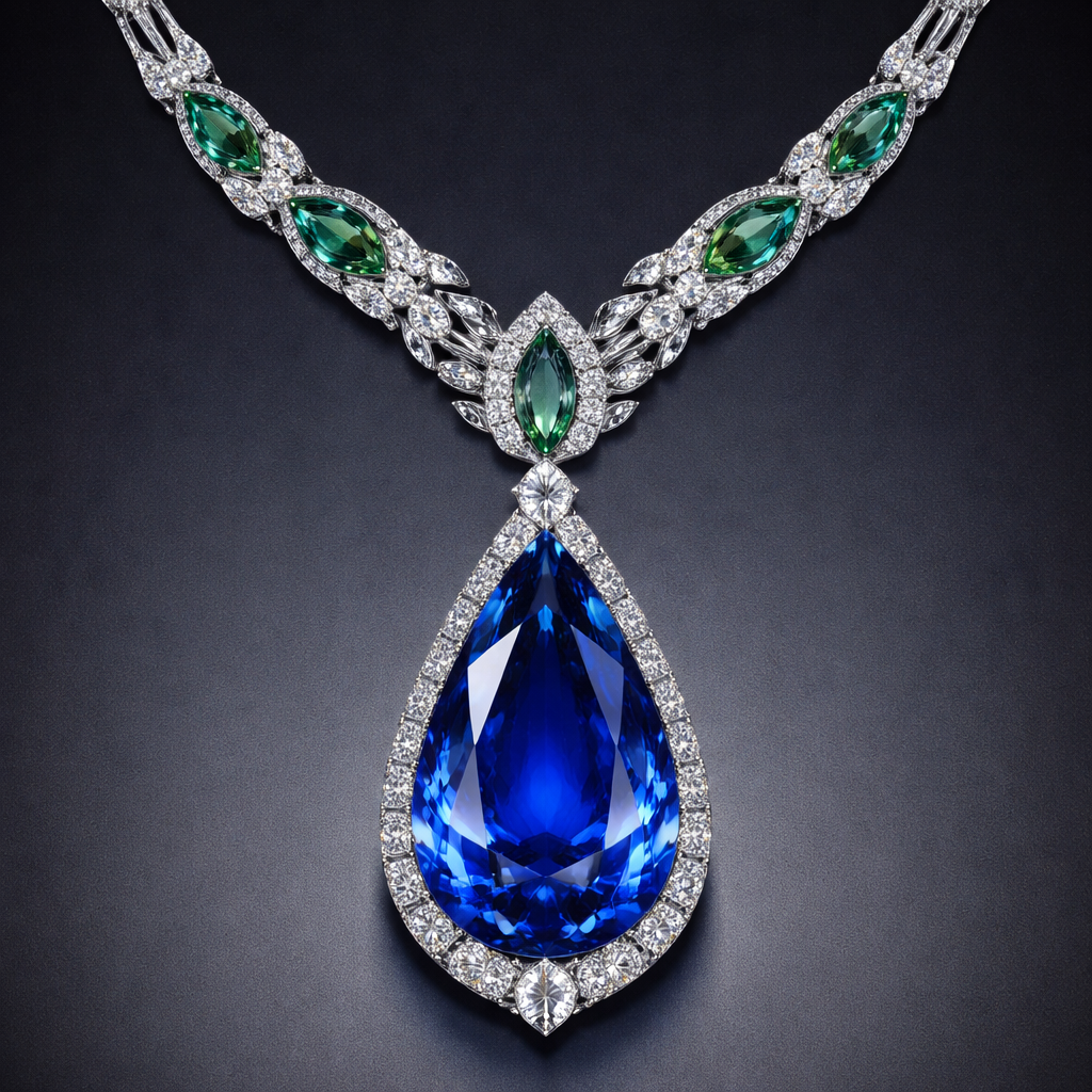 a 50 carat drop-cut blue sapphire gemstone and Navette-cut green emerald gemstone, FL IF clarity necklace, art_deco style