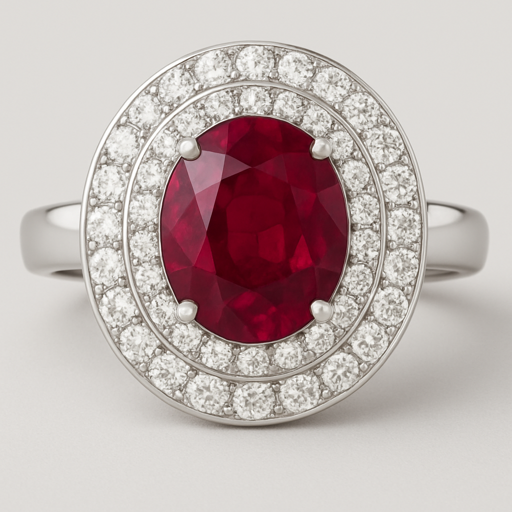 Create a flower style ring with a three-quarter carat oval center, stone and diamonds surrounding in a halo of individua...