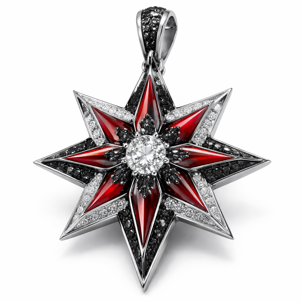 Geomatric architecture bold star pendant for men of edgy style of white diamonds and black diamonds and red enamel of white background