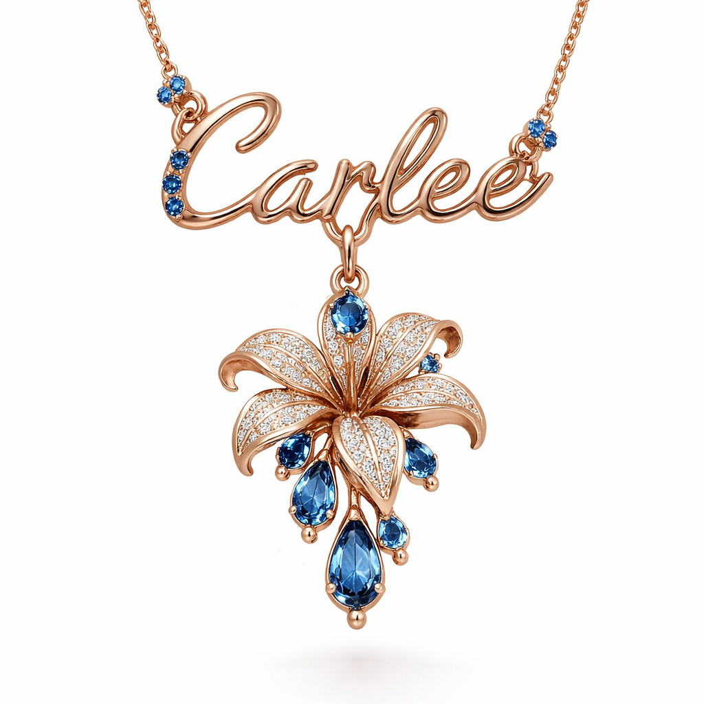 A modern women's necklace made of rose gold with sapphire stones. I want a pendant Lilly flower on the bottom and on top the Name Carlee