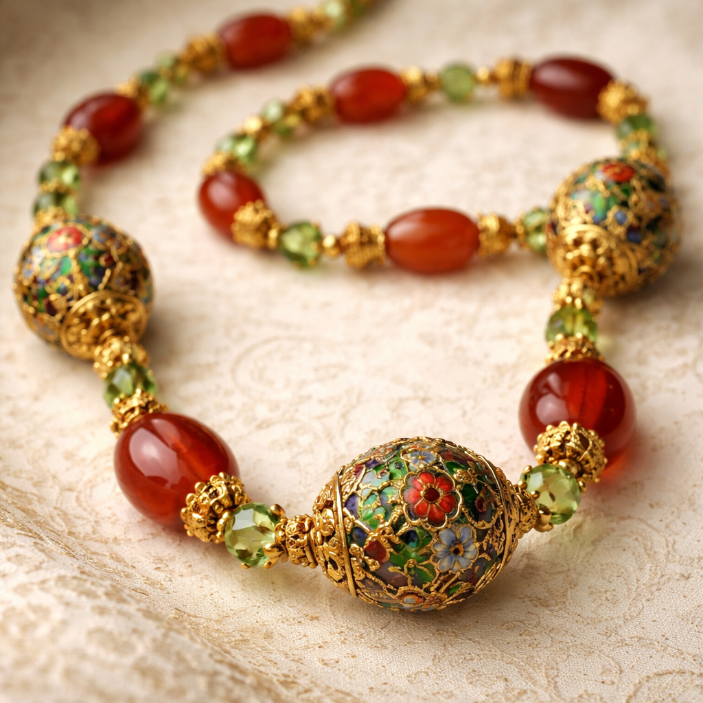 Gold cloisonné carnelian and peridot with gold spacer beads for beaded necklace
