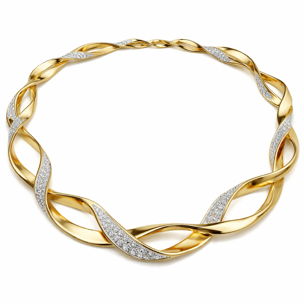 A flexible necklace that has links and articulations that inspired by one twisted flat wire and its light weight and has diamond and gold