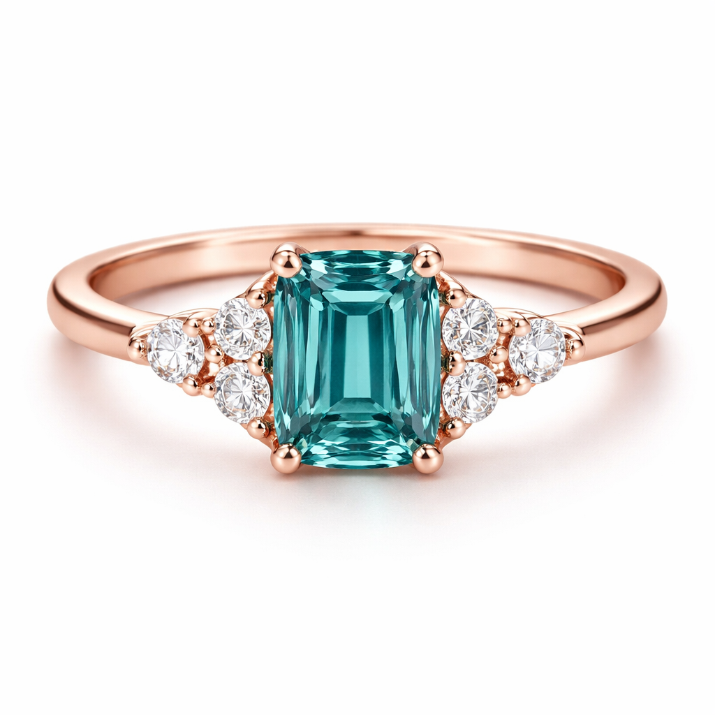 Teal moissanite .75 ct emerald cut center stone with three gems on each side two circular and one marquise. In rose gold