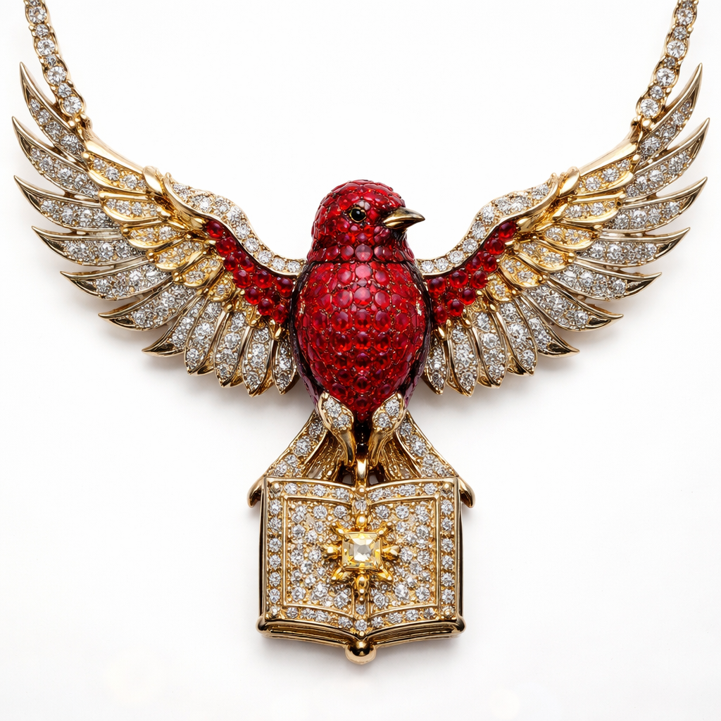 A red sparrow with the wings attached to on each side where the chain connects so the wings are open on the sparrow, and the sparrows made from rubies and diamonds, and the wings are made from silver and gold diamonds and at the bottom it’s holding a book the book is studied withstones of gold and diamonds, and that’s it for now so yeah that