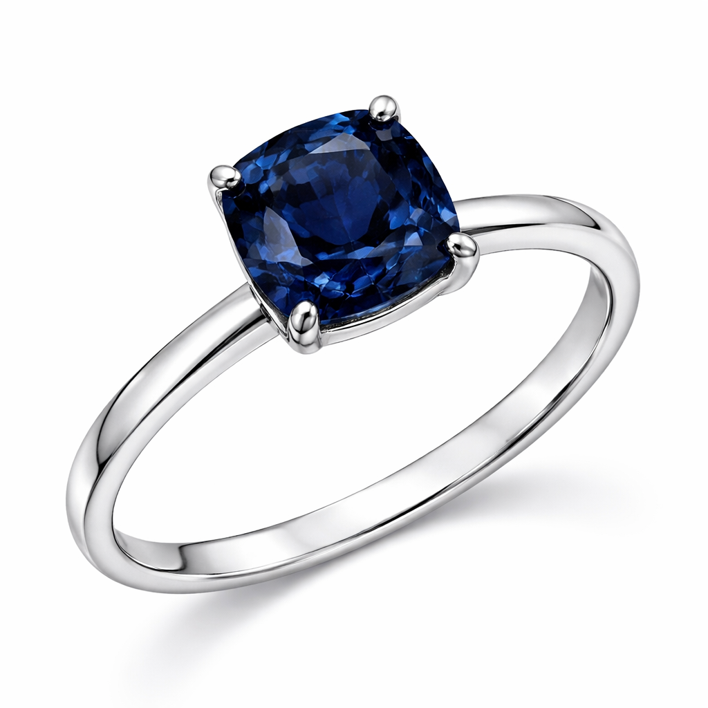 A women's ring. delicado anillo de oro blanco con piedra de zafiro azul más oscuro forma de colchón y sin piedras en el aro lo más limpio posible, modern style