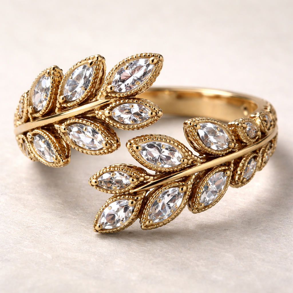 14K yellow gold olive branch ring with white sapphires as leaves , byzantine style