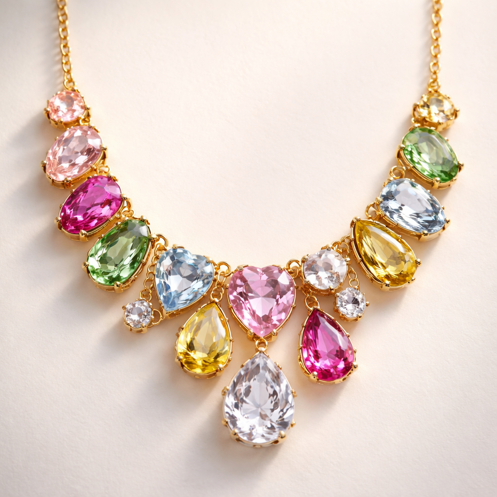 Gem stone necklace on a gold chain. Gem stones are different shapes and colors are light pink, hot pink, green, light blue, yellow, and white , bespoke style
