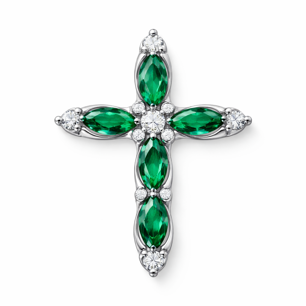 3 x 5 mm Marquise cut emerald white gold cross with a few diamonds accents. No bale. , classic style
