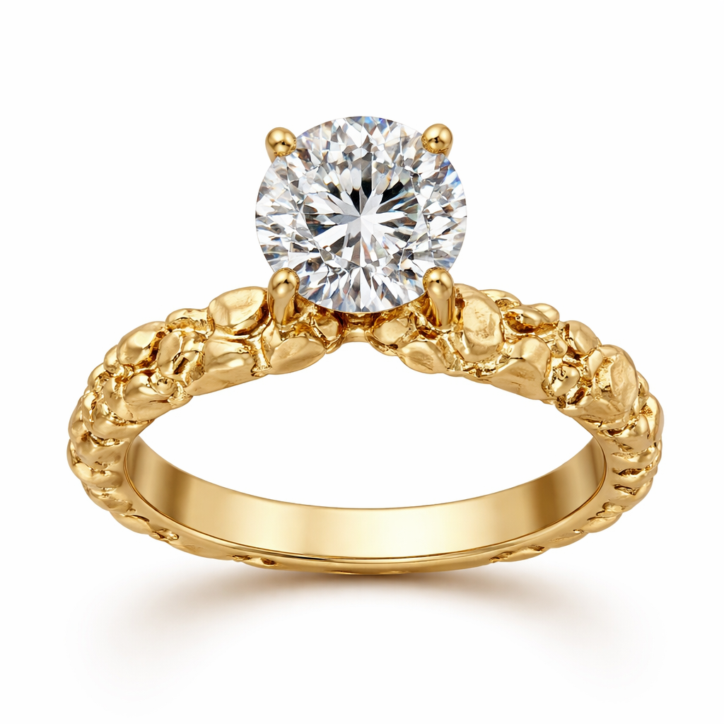 Yellow gold nugget ring with a 3ct round brilliant diamond solitaire that is propped up