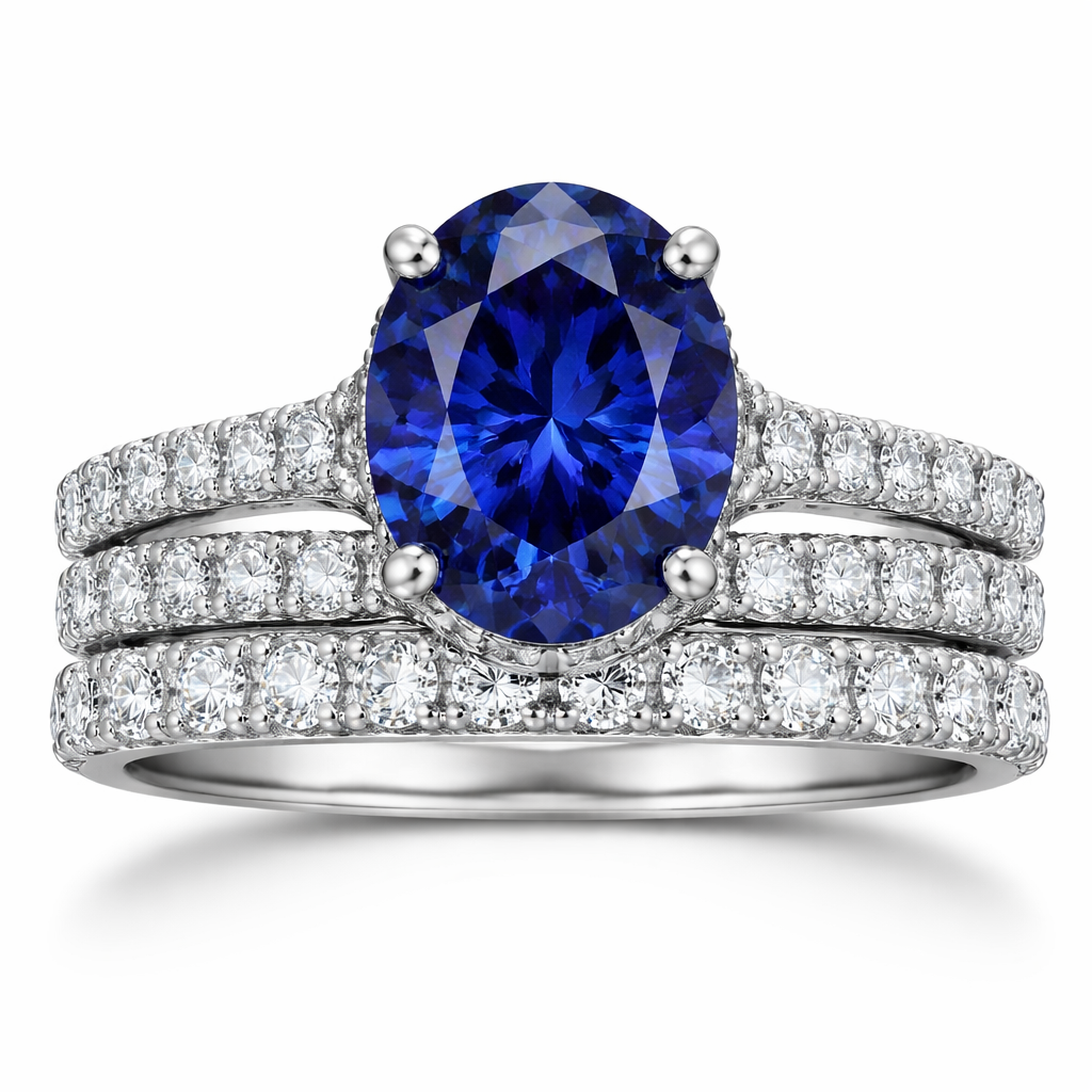 5-6 ct oval lab grown deep blue sapphire with lab grown diamonds going down the band and two more wedding bands attached to the main ring with lab grown diamonds also going on and a hidden halo on the main ring and no rail