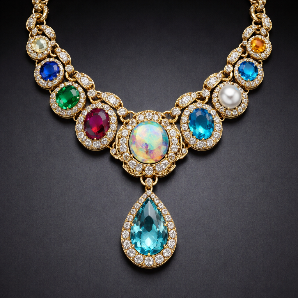 A luxury men's necklace made of gold with diamond and opal and topaz and garnet and aquamarine and turquoise and ruby and sapphire and emerald and pearl and amethyst stones suitable for daily wear