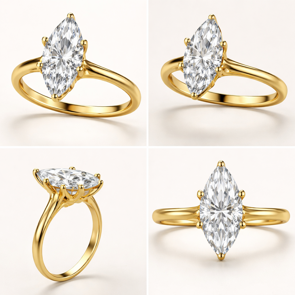 4 carat marquise solitaire ring with 6 prongs, yellow gold, and create a view from different angles , classic style