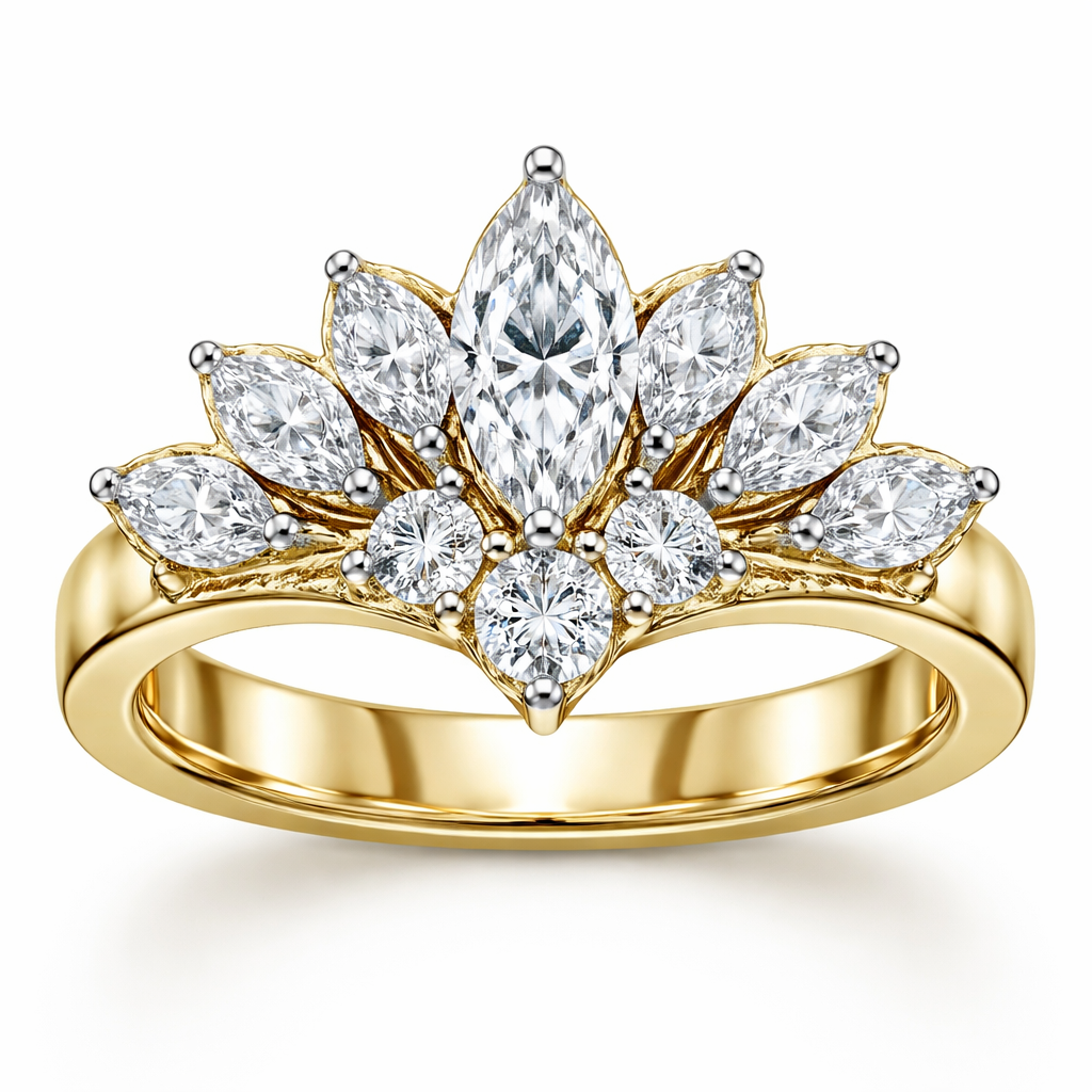 .6 karat marquise centered, with .25 round directly under it with 6 more smaller marquise diamonds and 2 .15 round diamonds mounted on a wide 14k yellow gold band. Make the design in a fan shape and use platinum prongs, cluster style