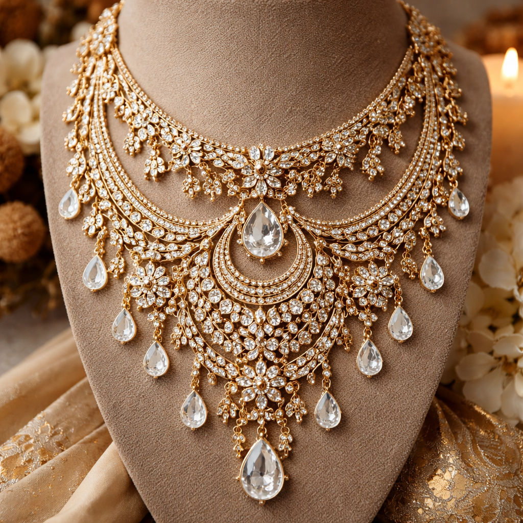 A bohemian women's necklace made of gold with diamond stones suitable for wedding. indian wedding