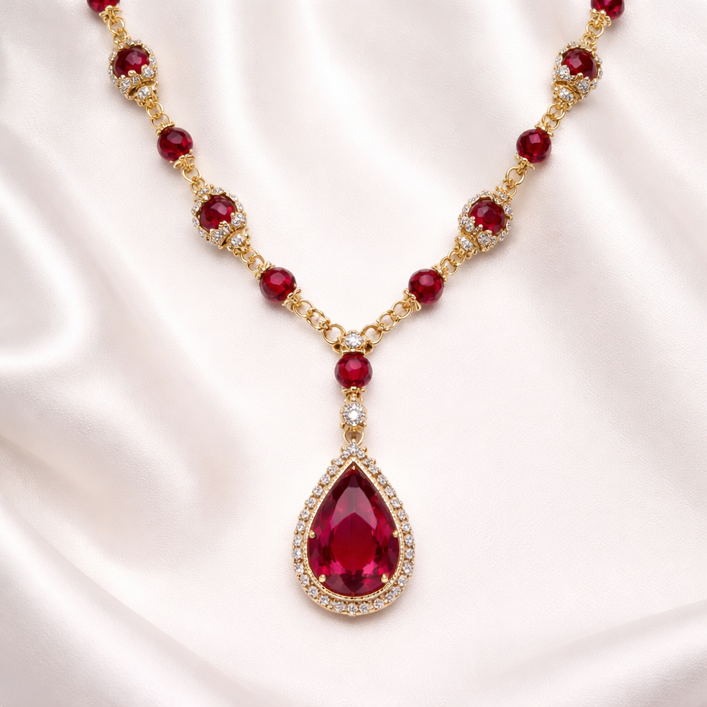 A women's ring made of gold with ruby stones. 根據圖片紫色墜子,設計貴氣的珠鍊
