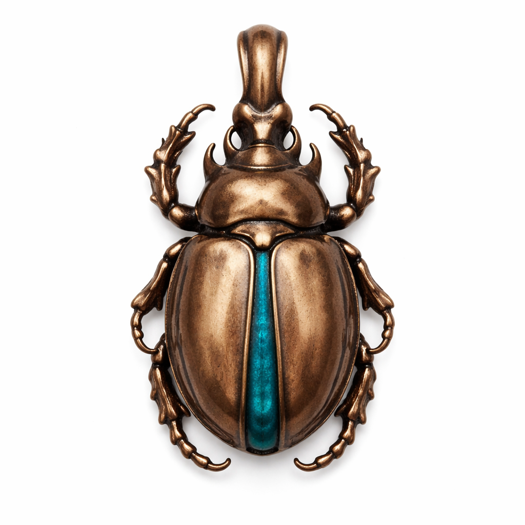 color: bronze design: a europian rhinoceros beetle, with a teal line between its closed wings