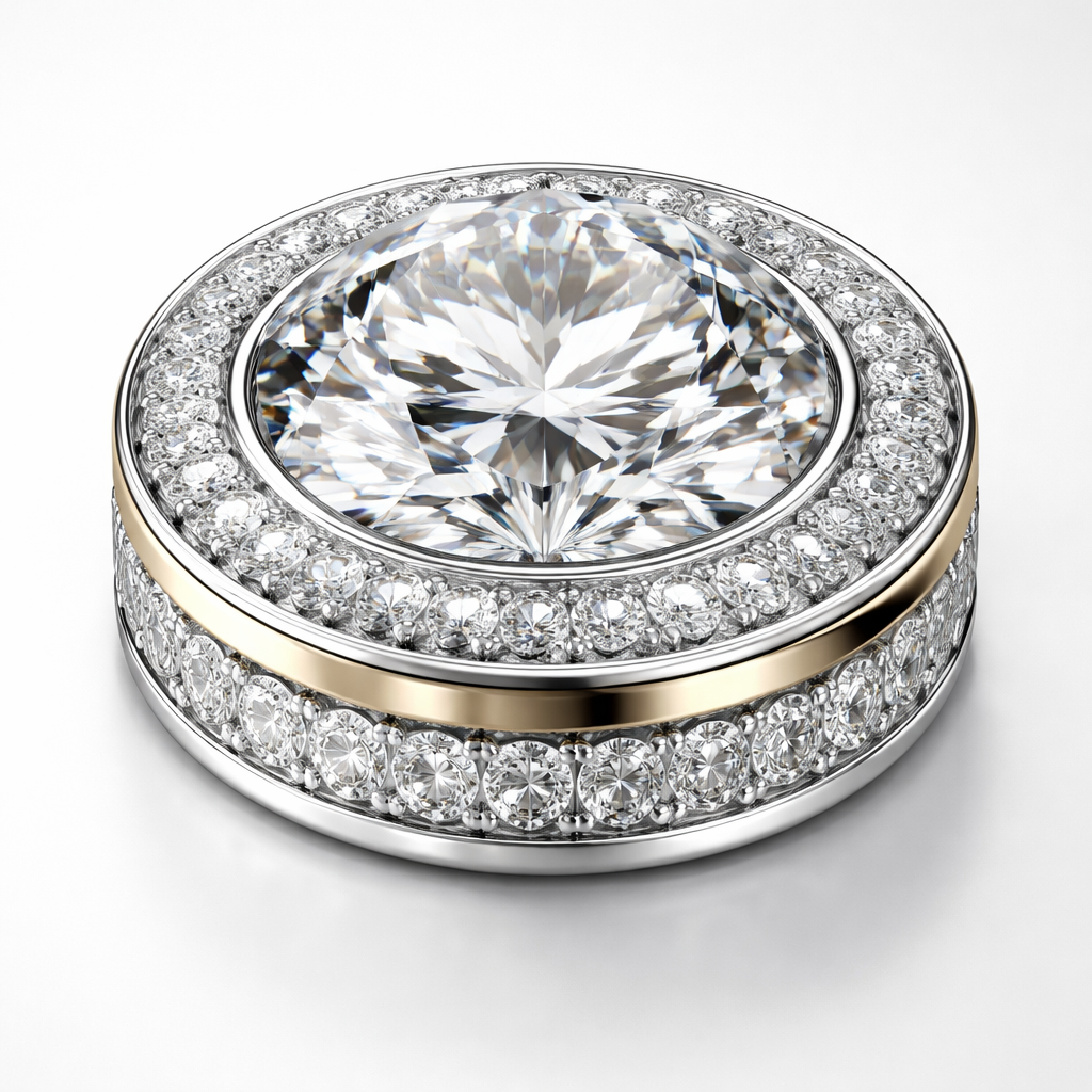Brilliant round diamond pendant hidden bail set in a white gold pave diamond bezel with a side Pave setting of diamonds in the side of the diamond bezel all the way around the diamond show the side profile of the bezel with the side diamonds in the picture remove the prongs in the center diamond and remove the bail make the side of the bezel a little thicker keep the thickness of the side basil but just have one row of pave Diamonds on the side basil with high polished gold showing up against the Pavey line of diamonds on the side bezel switch the high polished gold on the side basil to be in front of the line of pave Diamonds