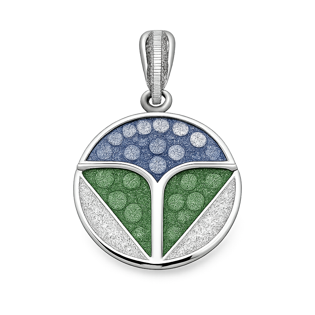 Make the snowbird ski resort logo only into a 14 karat white gold 12 mm pendant. Set blue diamonds where the blue color is in the logo and green diamonds where the green color is in the logo. Have the design picture look like a real piece of jewelry as much as possible.