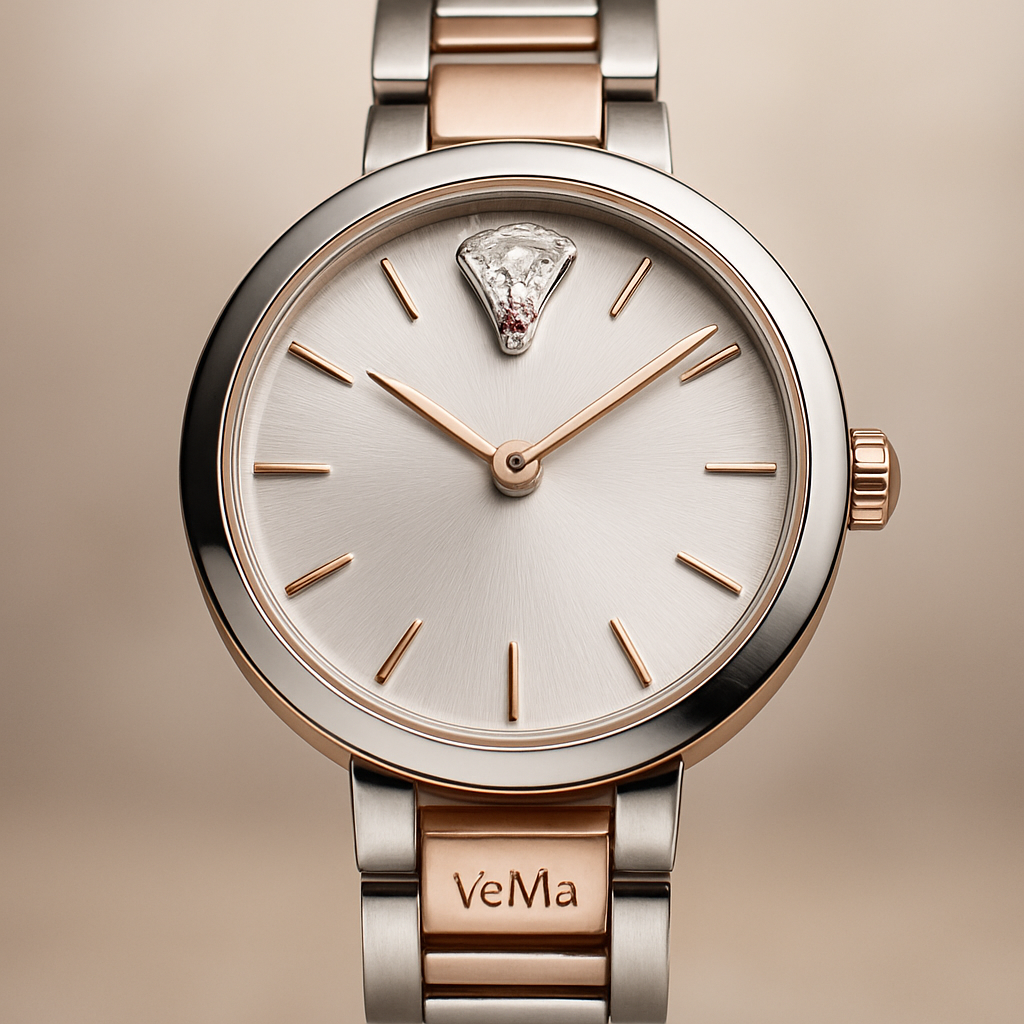 Uhr 2cm breit rund in silber-rosé Front gemischt mit einem Diamanten in Form eines Trapez in weiß und rosa alle Gravur VeMa innen, luxury style