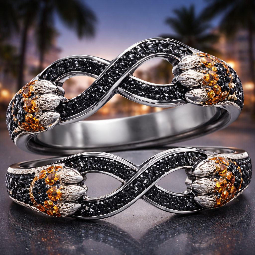 Infinite symbol solid bracelet that filled with black diamonds with city of cocoa palm trees and solid thick tigers paws that’s filled with orange and black gemstones. His and hers
