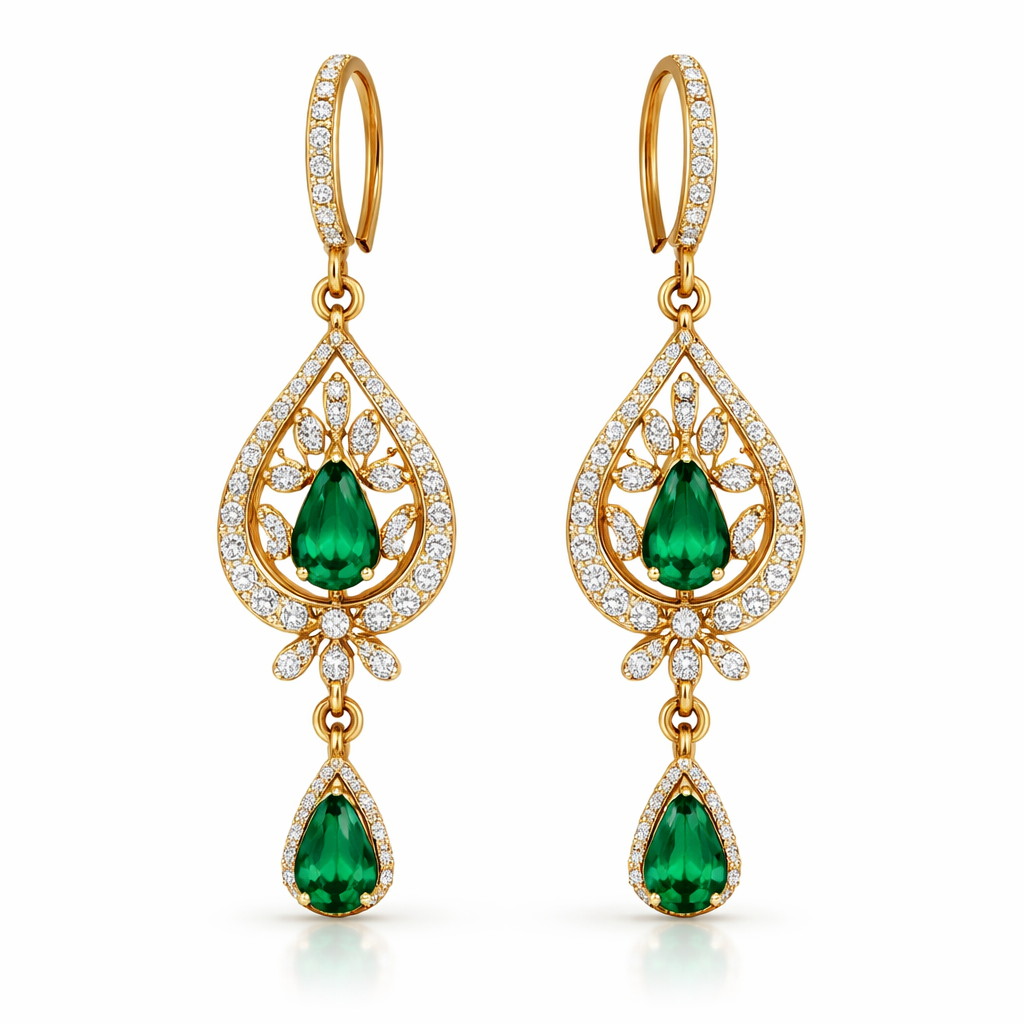 A women's pendant. Pendant Design (Total: 4.5 cm) Designer Naka (Loop): 0.5 cm. Ye chain mein dalne ke liye upar rahega aur pendant ko niche ki taraf highlight karega.Bali Hook: 1.0 cm. Ye kaan ke hole ke andar jayega aur design ko niche ki taraf dhakelega. Bali Style Tops (Total: 3.5 cm) Main Earring Body: 1.5 cm. Ye kaan ki lob (lole) ke bilkul niche se shuru hoga.Hanging Latkan: 1.0 cm. Ye earrings ko wo "moving look" dega jo aap chahte hain.Hanging Latkan (Drop): 1.5 cm. Ye pendant ke sabse niche move karega. Metal: 18k Gold (for high strength). Pendant Hook: "V-Shape" Earring Style: "Euro Hook" Finish: Yellow Gold base with Radium