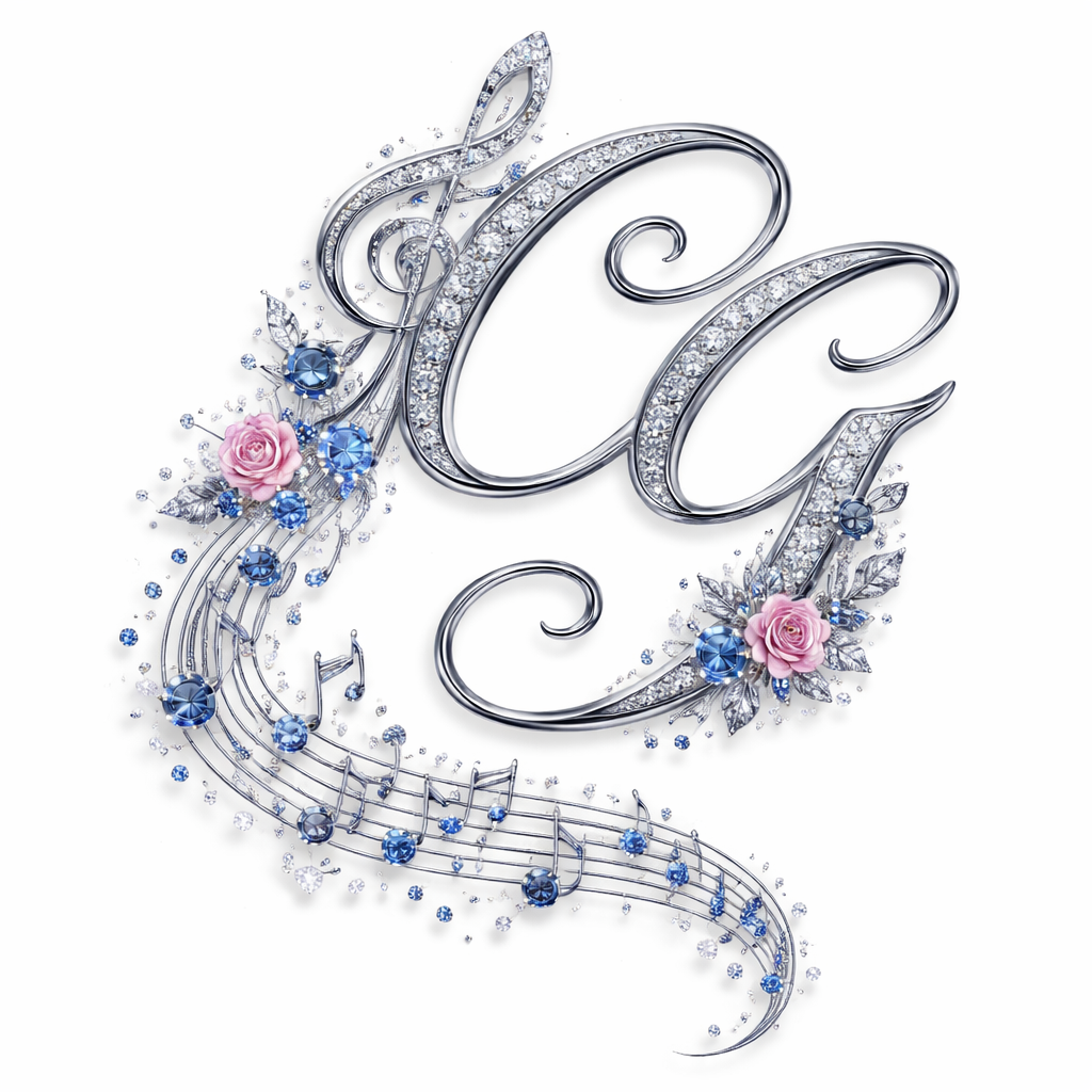 The letter C ave G in calligraphy with the music note and a stream of music notes and small roses diamonds blue sapphires , avant_garde style