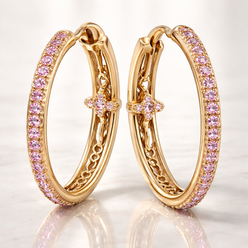 Thin pink sapphire Pavé gold hoops with cross design on the back