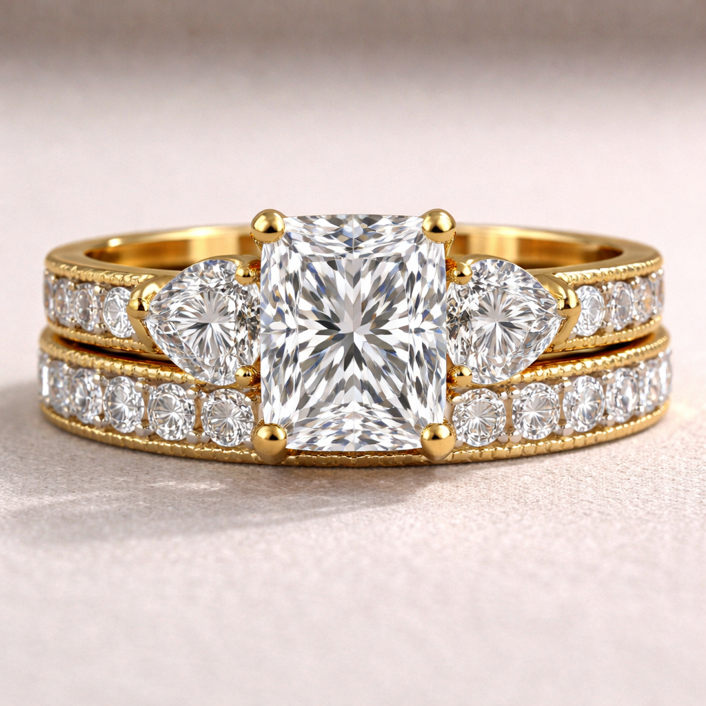 A 14 or gold band with a 2ct radiant diamond flanked by .5 ct heart shaped diamonds. Add a princess cut anniversary band on each side of center ring.