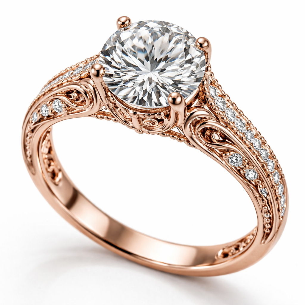 Luxury jewelry: Elegant rose gold ring, large solitaire diamond, pavé band, intricate filigree, exceptional craftsmanship, high polish finish.