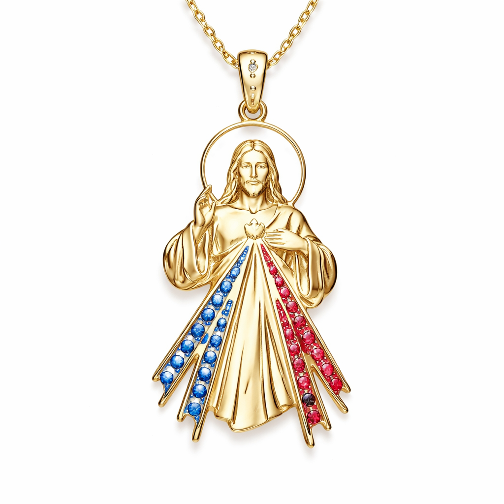 Divine mercy Jesus pendant with blue saphires and rubies on the rays , minimalist style