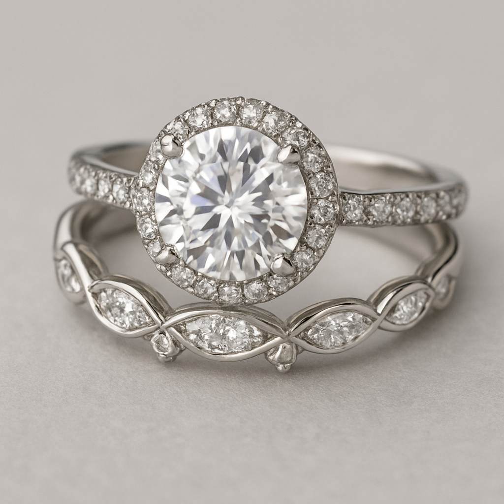 White gold 3 carat round halo ring with marquise wedding band, bespoke style