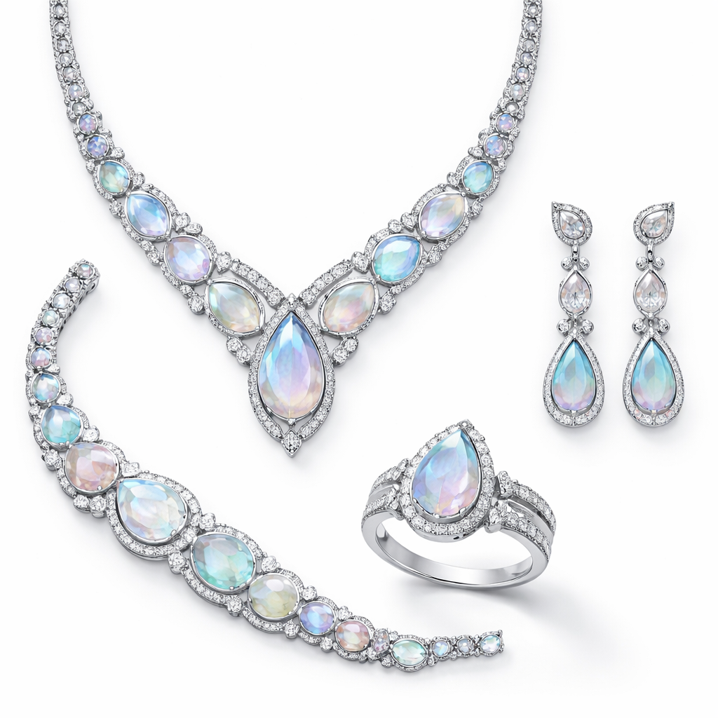 طقم كامل من قلاده واسواره وخاتم وحلق بتصميم عصري ناعم وفاخر بلامسات جديده مختلفه وغريبه مصمم من معدن الفضه مع احجار كريمه بالوان فاتحه مدرجه سماويه متجانسه اكثر