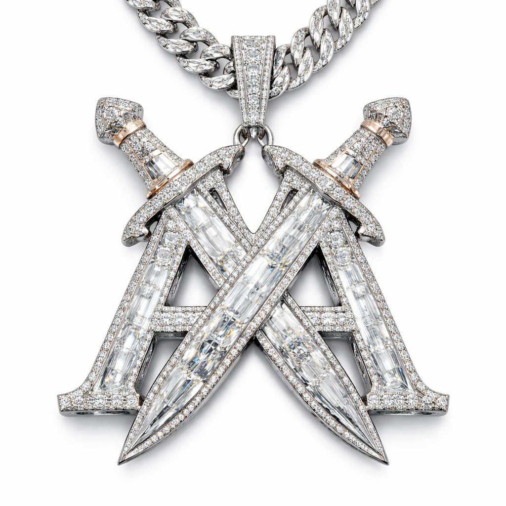 Make the A’s out of the 2Swords 3.5 inch pendant with 2 A’s with 2 crossed swords out of the 2’A VVS DIAMOND BAGUETTE DIAMOND The Pendant: The pendant features a "one-of-a-kind" design with a mix of . also features unique pyramid-cut jewels and an elevated structure. The piece is flooded with high-quality, brilliant-cut diamonds. The style generally consists of thick, wide, 14k-18k white or rose gold Cuban links completely flooded with VVS natural diamonds. The style generally consists of thick, wide, 14k-18k white or rose gold Cuban links completely flooded with VVS natural diamonds. , vintage style