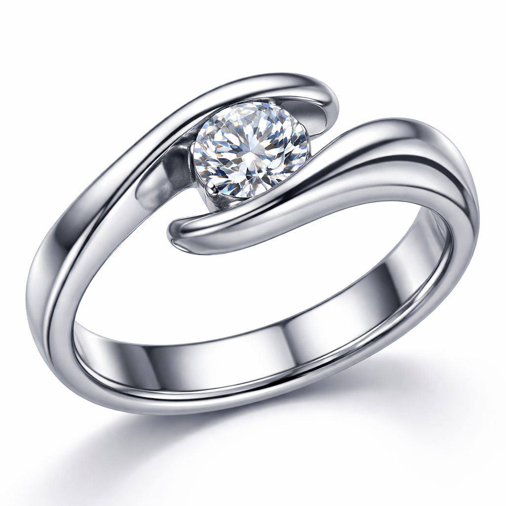 A modern, feminine ring design crafted from high-quality stainless steel with a sleek polished finish, featuring a sparkling zircon centerpiece. The design includes smooth, minimal curves that reflect elegance, softness, and contemporary style.”, modern style