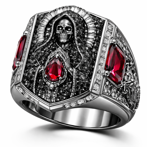 A luxury men's ring made of titanium with diamond and ruby stones. una Santa Muerte de diamantes color negro