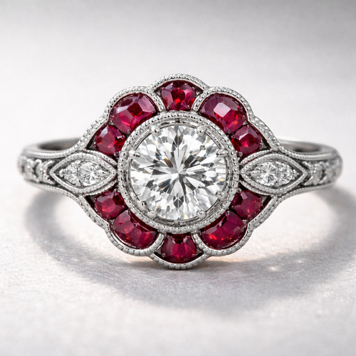 A vintage women's ring made of platinum with diamond and ruby stones suitable for engagement