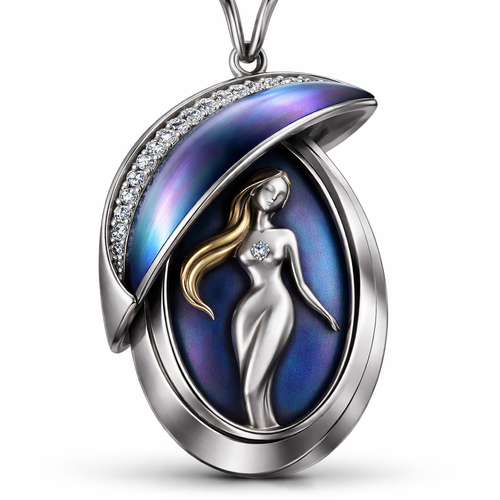 A women's pendant made of titanium. a two layered pendant the bottom has a women structure and the top open and closes