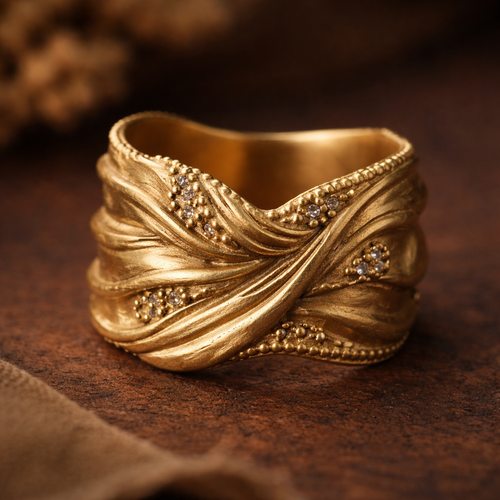 Old hand made ring, like a piece of colth made of matt gold, wide add elegant