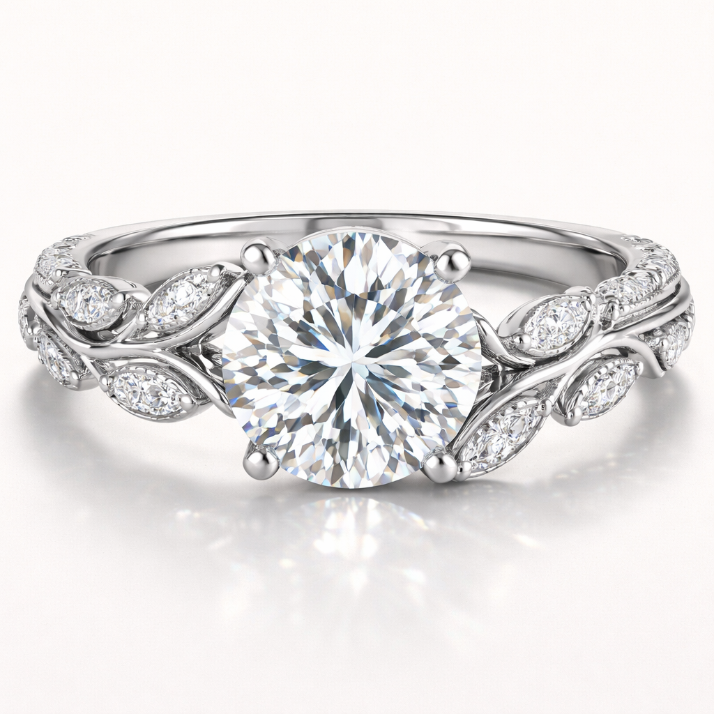 Create ring with .6 karat marquise centered, with .25 round stone directly under it with 6 more smaller marquise diamond...