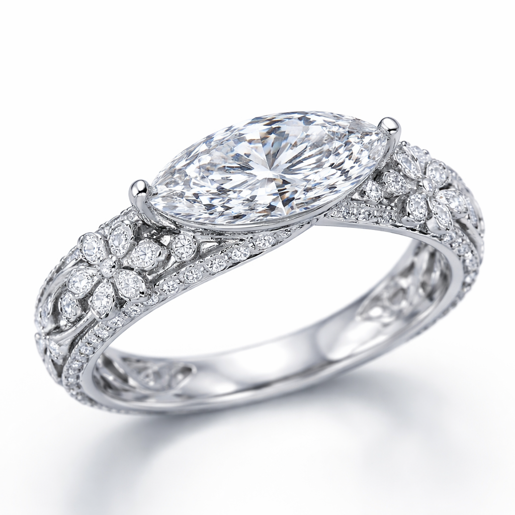 Ring with curved band with flowers pattern on it with small diamonds on it and a big marquis diamond 3 carat horizontally