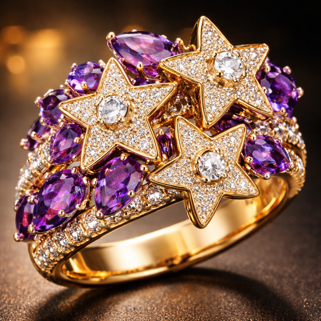 A luxury women's ring made of gold with amethyst stones suitable for party. une bague en forme de étoiles et le diamant a l'intérieur de l'étoile et en or, luxury style
