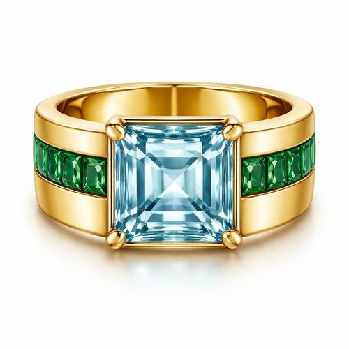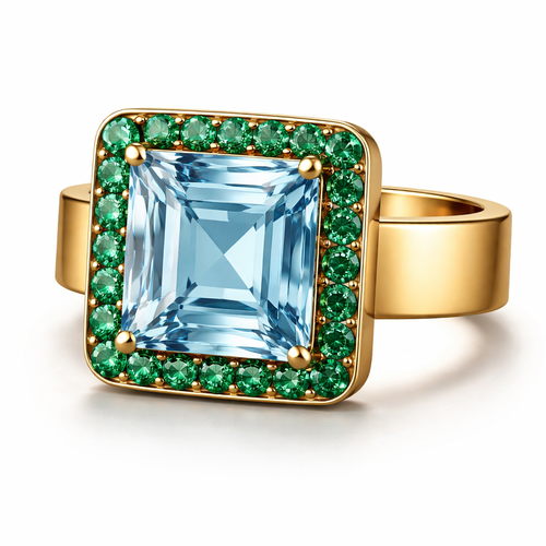 Square emerald cut, aquamarine surrounded by emeralds on wide gold 18 karat gold band