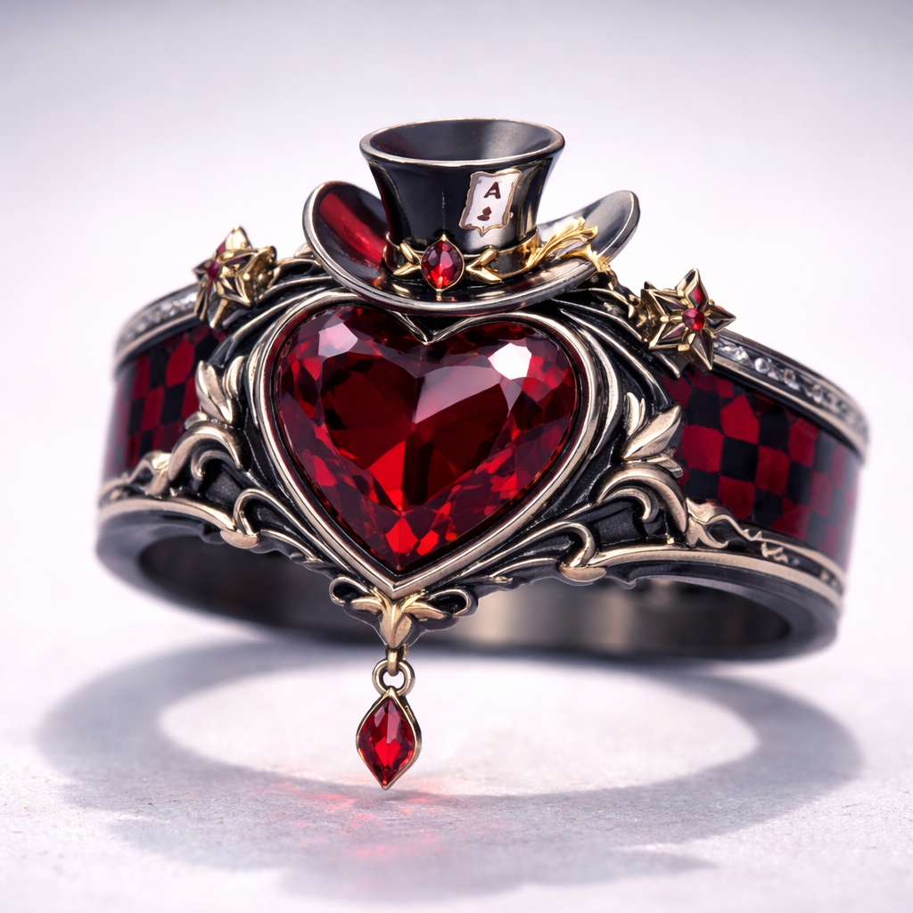 Make me a ring Lyney themed from genshin impact. Red and a dark blood red using a black and slightly lighter then blood red, red checkered pattern.