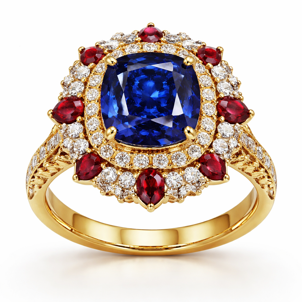 Um anel de ouro , com pedras azuis e vermelhos, rodeado de brilhantes com um formato de solitário